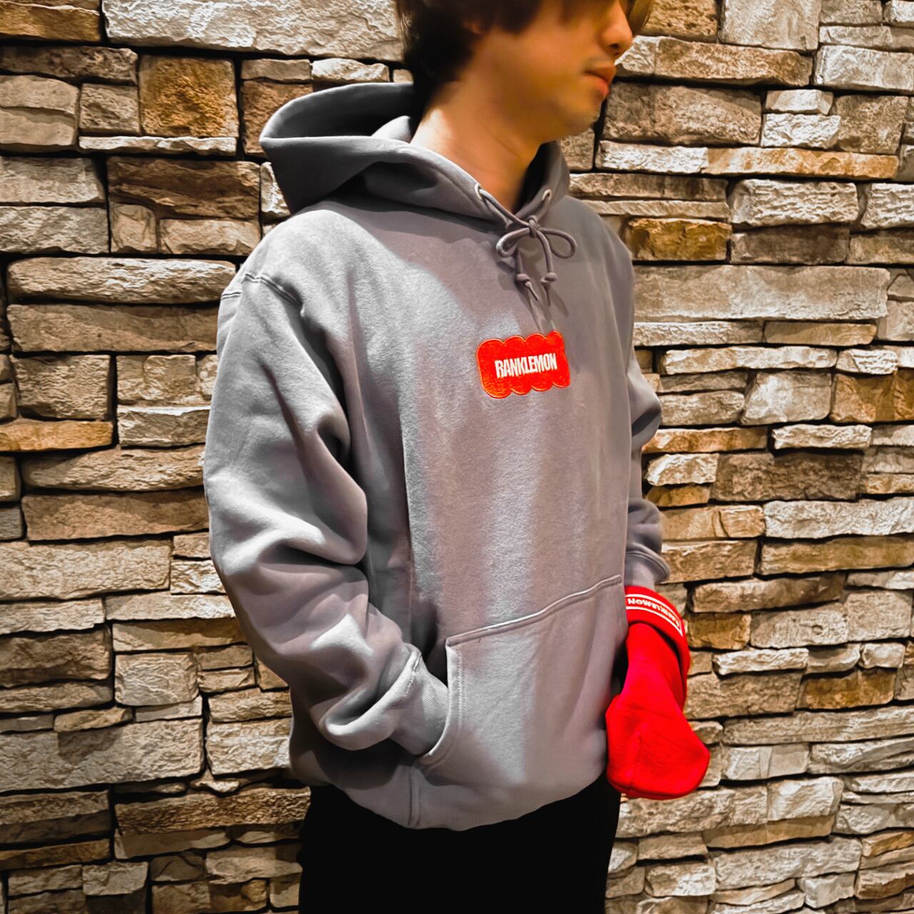 RANKLEMONを象徴するメインロゴを、中央に配置したフーディ。 ロゴは刺繍となっております。 素材:綿75% ポリエステル25% 12oz カラー:ストーンブルー 生地:裏起毛