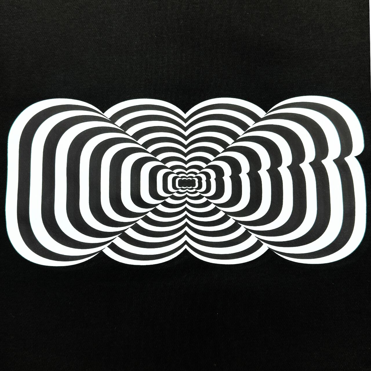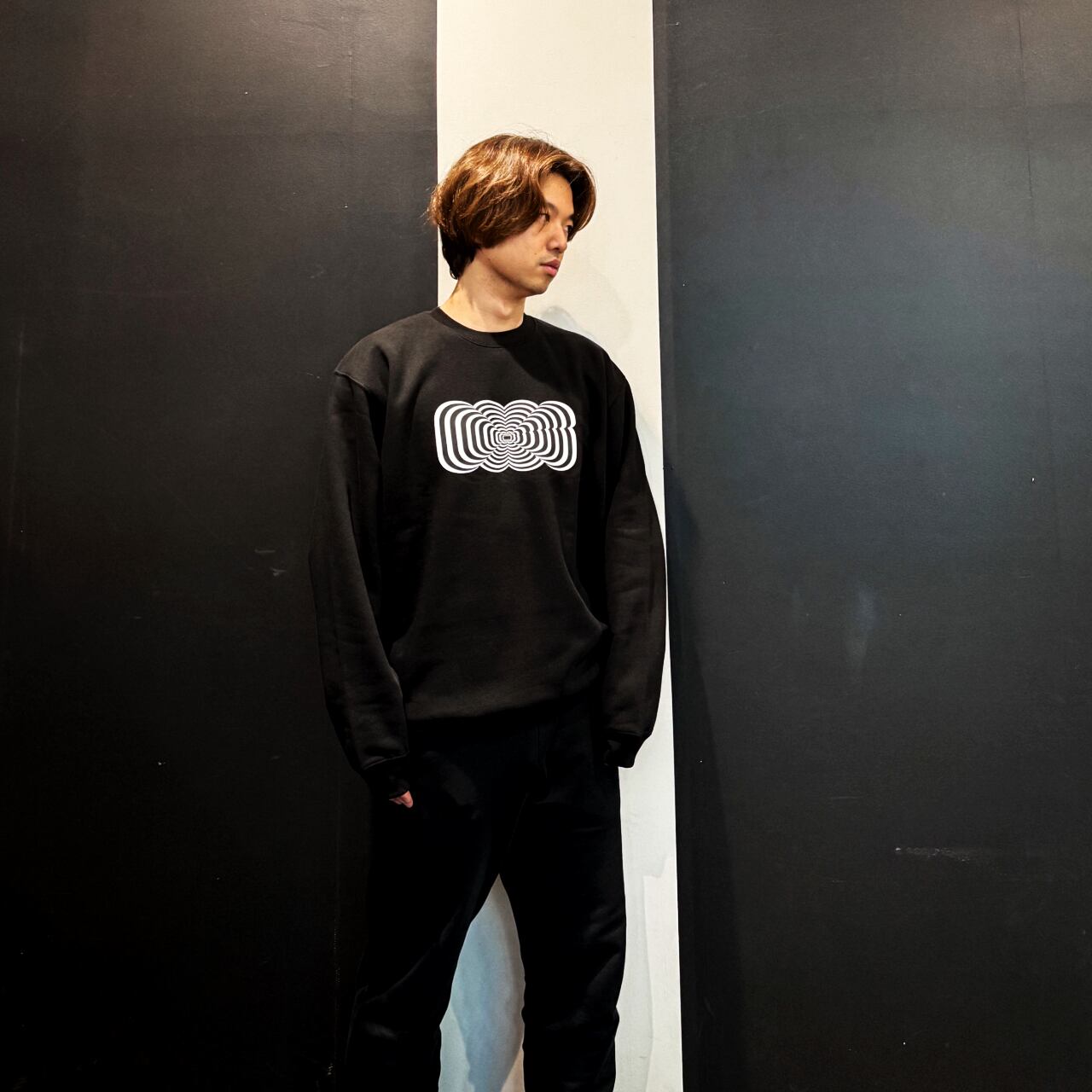 中央に配置された反復するロゴ。 視点は吸い込まれ、中心は曖昧になる。 素材:綿52% ポリエステル48% 10oz カラー:ブラック 生地:裏起毛